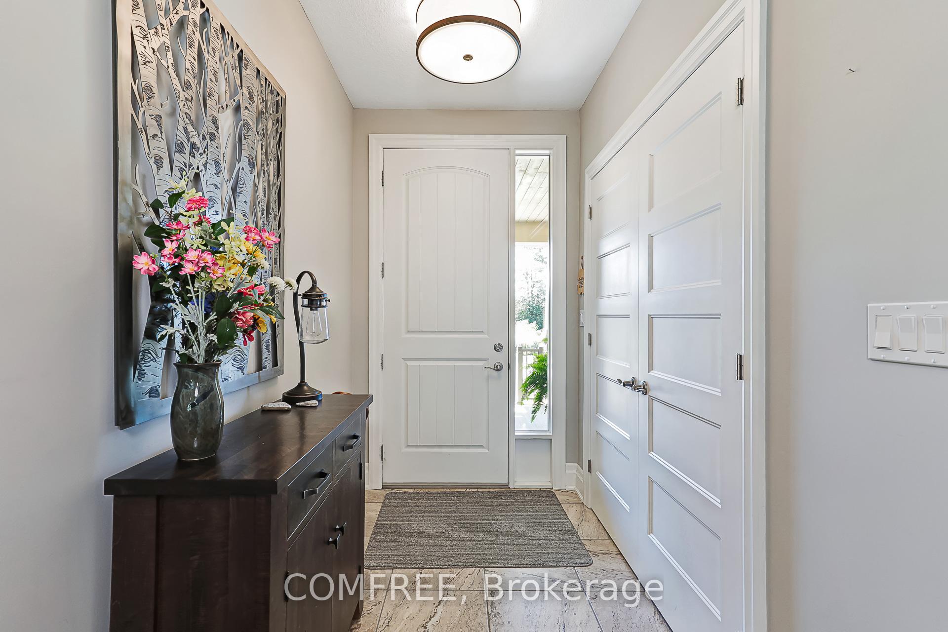 106 High Bluff Lane is located on one of the most sought after streets in Thornbury. This 2+2 Bedroom Bungalow with a 3-Car Garage, and over 3600sqft of living space, is on a private, fully fenced, park-like, 1/4 acre lot backing onto greenspace and a ravine. It is a beautifully landscaped property with close to $200K spent on perennial gardens, mature trees, inground sprinkler system, low voltage landscape lighting, interlock driveway that can easily accommodate 5 cars, interlock patios, and a 12' x 14' pavilion. There is also a garden shed with separate electrical panel. The large front porch is a great place to sit and relax. The main floor consists of Engineered hardwood floors and has a large open plan chef's dream kitchen with Bosch Appliances - 5 Burner Gas Cooktop, Built-in Range &Microwave/Convection oven, French 3-door Fridge, Dishwasher and a Marvel Beverage fridge. There is a Cathedral ceiling in the dining room and great room with floor to ceiling stone gas fireplace and huge windows & sliding door looking out to the backyard. A large primary bedroom has an ensuite with heated floors and walk in closet. A front bedroom/office completes the main floor. The basement boasts 8.5' ceilings with large, upgraded windows and the ultimate man cave with custom bar and a gas wood stove that keeps the basement comfortable all year long. There is also huge craft studio that could easily become a games room or gym space. 2 more nice sized bedrooms and a bathroom with heated floor complete the basement area. All the closets have been custom designed for the ultimate in storage solutions. Custom built-ins in the garage and a Generac generator are just some of the extra features of this property. You will have a 2-minute walk to access the Georgian Trail, a 5-minute walk to Goldsmith's Farm Market, a 20-minute walk to Foodland & LCBO and a 30-minute walk to town to enjoy any of the many coffee shops and restaurants