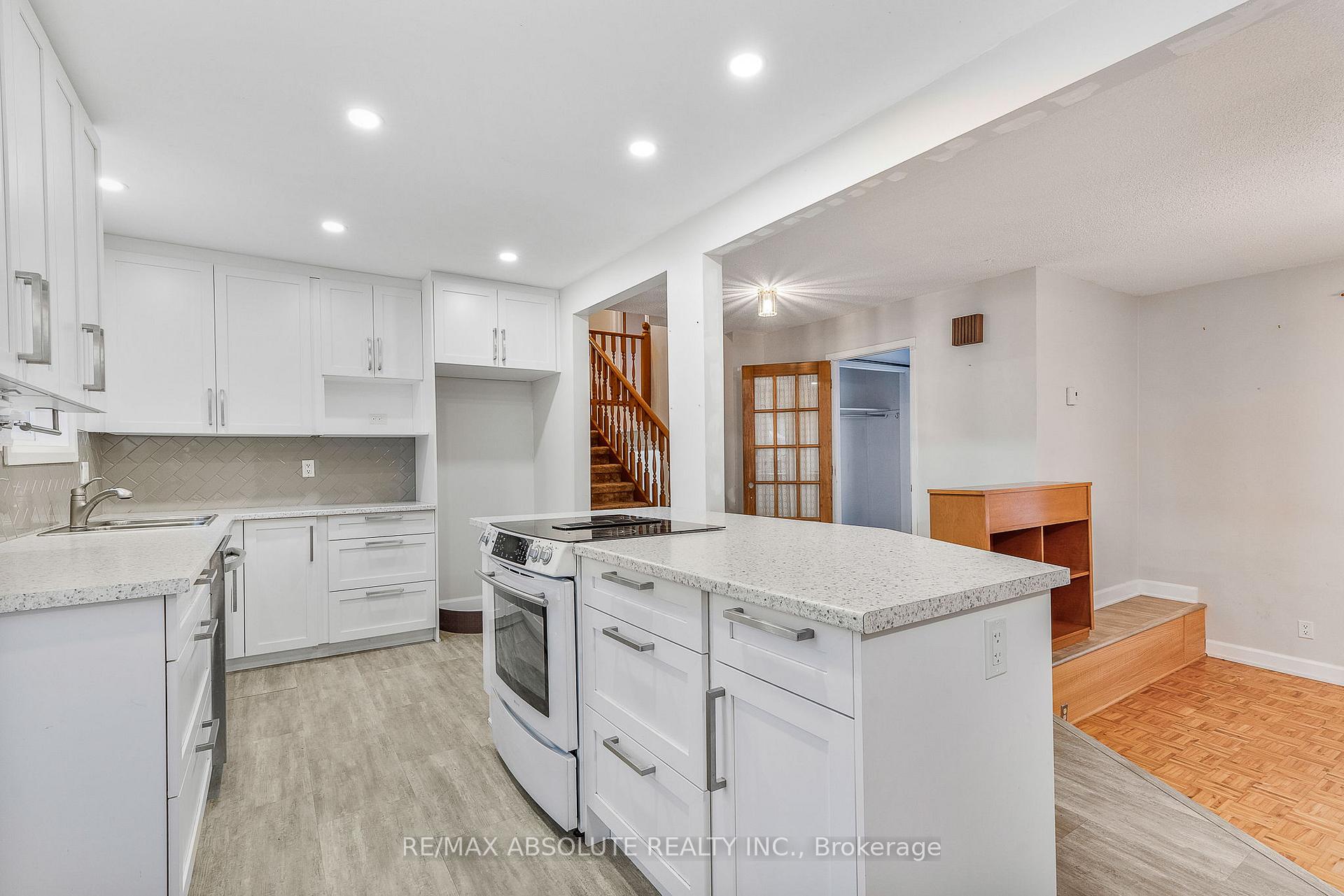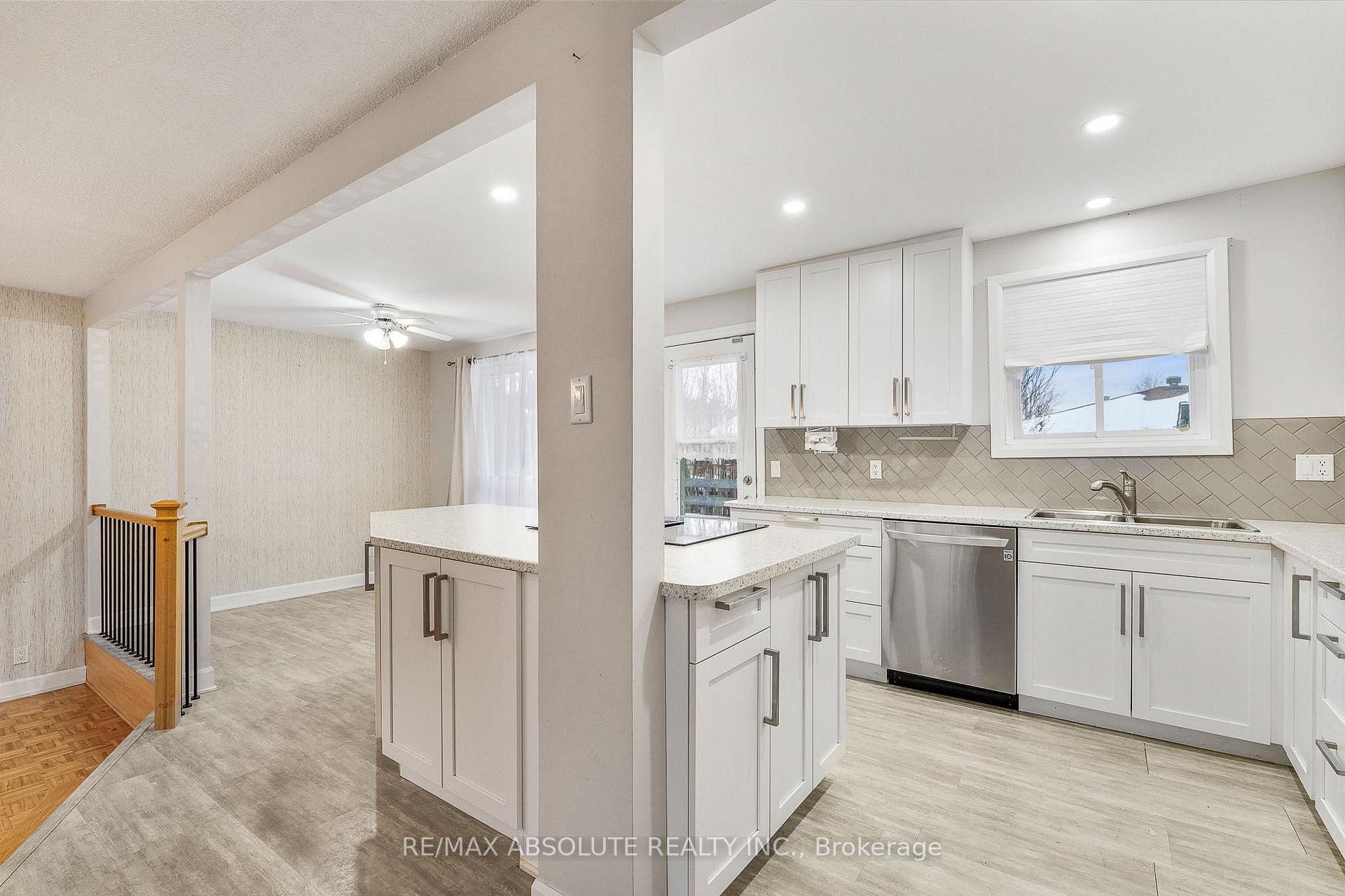 This beautifully maintained 4 bedroom, 1.5 bath split-level home sits on an impressive 75-ft wide lot in Rockland's. Step into the inviting enclosed foyer, complete with a french door and an oversized closet. The sunken living room features an oak railing and a bright picture window that fills the space with natural light. The redesigned open-concept kitchen offers exceptional functionality, highlighted by three banks of soft-close drawers, a stylish tile backsplash and a generous center island-perfect for cooking and gathering. The second level includes two comfortable bedrooms, both with extensive closet space, along with a fully updated 4-piece bathroom. A few steps down from your main living space, you'll find a third & fourth bedroom ideal space for teens, guests or a home office. The finished lowest level features a spacious L-shaped family room and a dedicated laundry area. A large low-ceiling storage section offers convenient room for seasonal items and extras. Additional updates include PVC windows and a protective membrane around the foundation (2014).