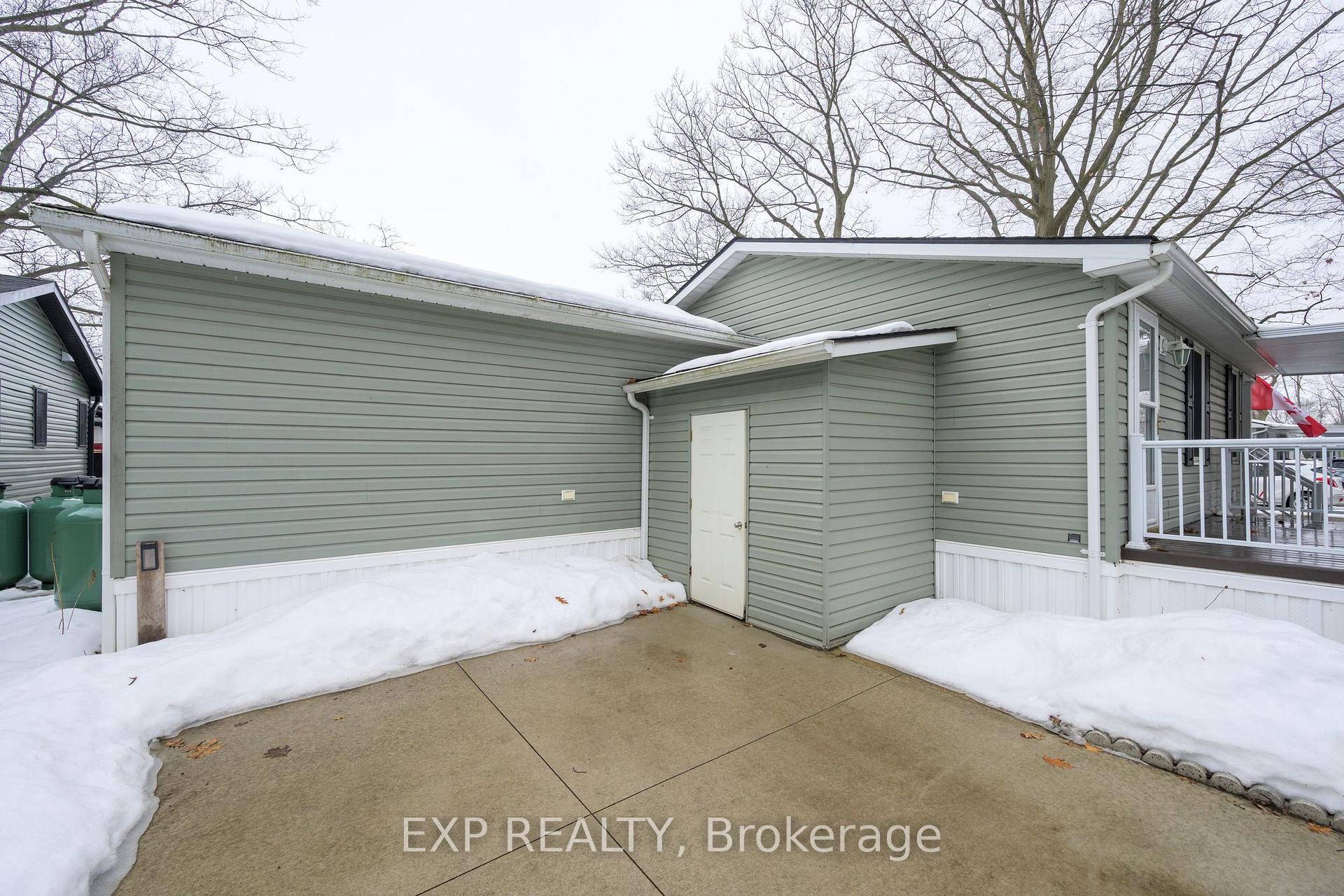 Wonderful value in Oriole Park Resort, Komoka's premier year-round 55+ gated community, providing an ideal lifestyle for retirees or anyone looking to downsize without compromise. This bright and spacious 1103 sq ft bungalow-style modular home offers cathedral ceilings, an open-concept kitchen with island and gas stove, a separate dining room, and a cozy living room with fireplace. The home also includes a den/office, 2-piece powder room, in-suite laundry, and a primary bedroom with 3-piece ensuite. Brand new furnace! Outdoor features include a covered front porch, side deck, carport, two storage sheds, concrete walkway, and a large patio for relaxing or entertaining. With dedicated on-site management and a welcoming atmosphere, enjoy resort-style living with an impressive range of amenities including: clubhouse with salon & spa, golf simulator, dog groomer, fitness room, pickleball court, library, and licensed bistro/bar. Plus beautifully landscaped grounds with koi ponds, gardens, shuffleboard, off-leash dog park, inground pool, and community BBQ/firepit areas. This vibrant community exudes pride of ownership, while offering comfort, convenience, and an active lifestyle.