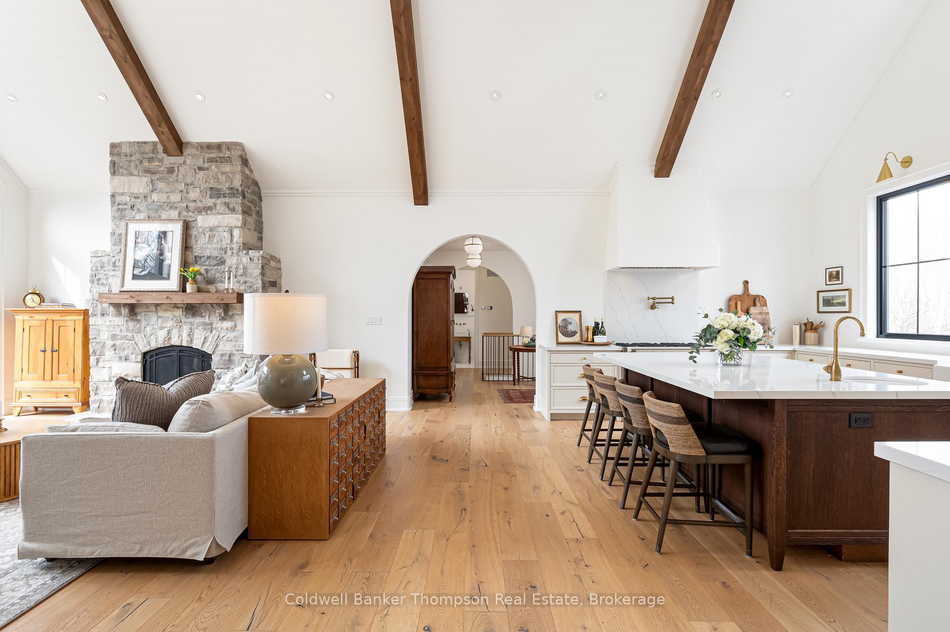 This exceptional high-end bungalow blends the charm of a European villa with modern luxury. Set well back from the road and approached by a circular driveway, the home boasts a striking exterior with wood siding, vertical board and batten, painted brick accents, and arched doorways. Inside, the kitchen is a masterclass in design, featuring an oversized island with a prep sink, panel-front appliances, and a stunning Elise propane range with pot filler. A walk-in pantry offers seamless storage. Vaulted ceilings in the kitchen and living room enhance the sense of space, while a propane stone fireplace anchors the open-concept design. A full wall of windows opens to an exquisite outdoor living area: a custom hexagonal stone patio surrounding a beautiful pool and mostly level, fully fenced backyard. The screened Muskoka Room with a wood-burning fireplace provides an inviting retreat, while the adjacent dining room is ideal for entertaining. The private bedroom wing includes two spacious guest bedrooms sharing a 5-piece Jack and Jill bathroom, and the rear-positioned primary suite offers serene backyard views. Its spa-like ensuite features a freestanding tub, glass-enclosed shower, and double vanity, while the walk-in dressing room provides ample storage. The opposite wing includes a large laundry room with folding surface, drying rack, and stylish laundry sink, as well as a mudroom with built-in storage and access to the heated double garage, currently a workshop but easily converted. The lower level offers a generous rec room, two additional bedrooms, and a 3-piece bathroom. A whimsical playhouse under the stairs adds charm, while a spacious storage room and tidy utility area complete the space. A rare find crafted with impeccable design, this home is a perfect blend of style and functionality.