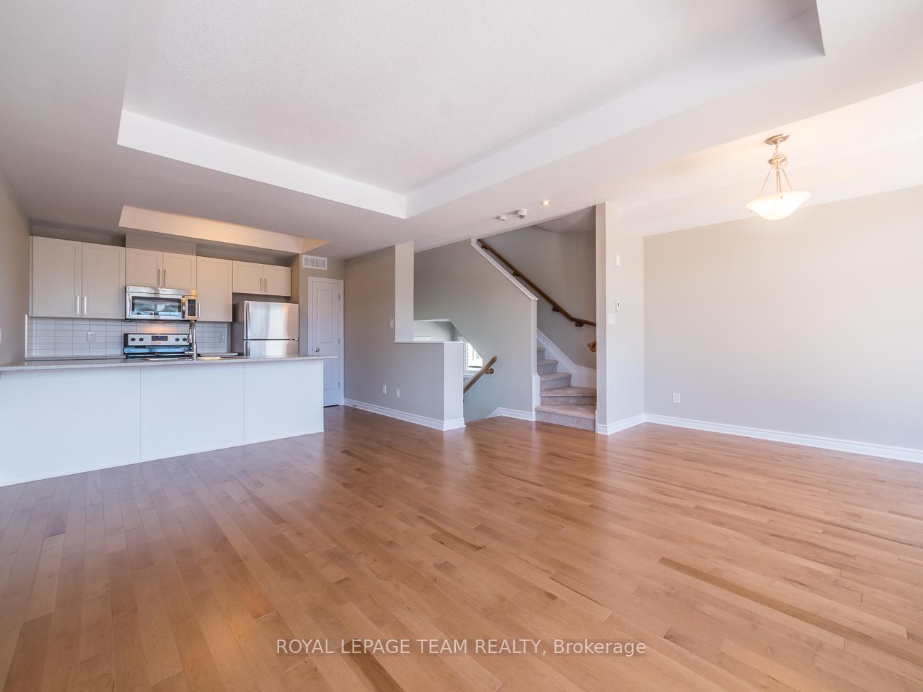 This 2 bedroom 1.5 bathroom end-unit townhouse is ideally located in Kanata West. Close proximity to the Tanger Outlets, CTC, Costco, shopping, park, restaurants and recreational facilities. Large south facing windows offer an abundance of natural light throughout the open concept kitchen, living & dining room. Hardwood floors throughout main living area. The kitchen offers pantry, stainless steel appliances (stove, fridge, dishwasher & microwave/hood fan) and peninsula/breakfast bar. Primary bedroom features large walk-in closet. Custom roller shades throughout. Private balcony off the dining room, ideal for year round BBQing. Front loading washer & dryer. Central Air Conditioning. Parking for 2 cars (including deep 1 car garage which provides additional storage). This is a smoke & pet free home. Ideal home for professional/individual/couple. Tenant pays utilities. Note, these units do not have backyards. Built on a slab (no basement). Available February 1st 2026.