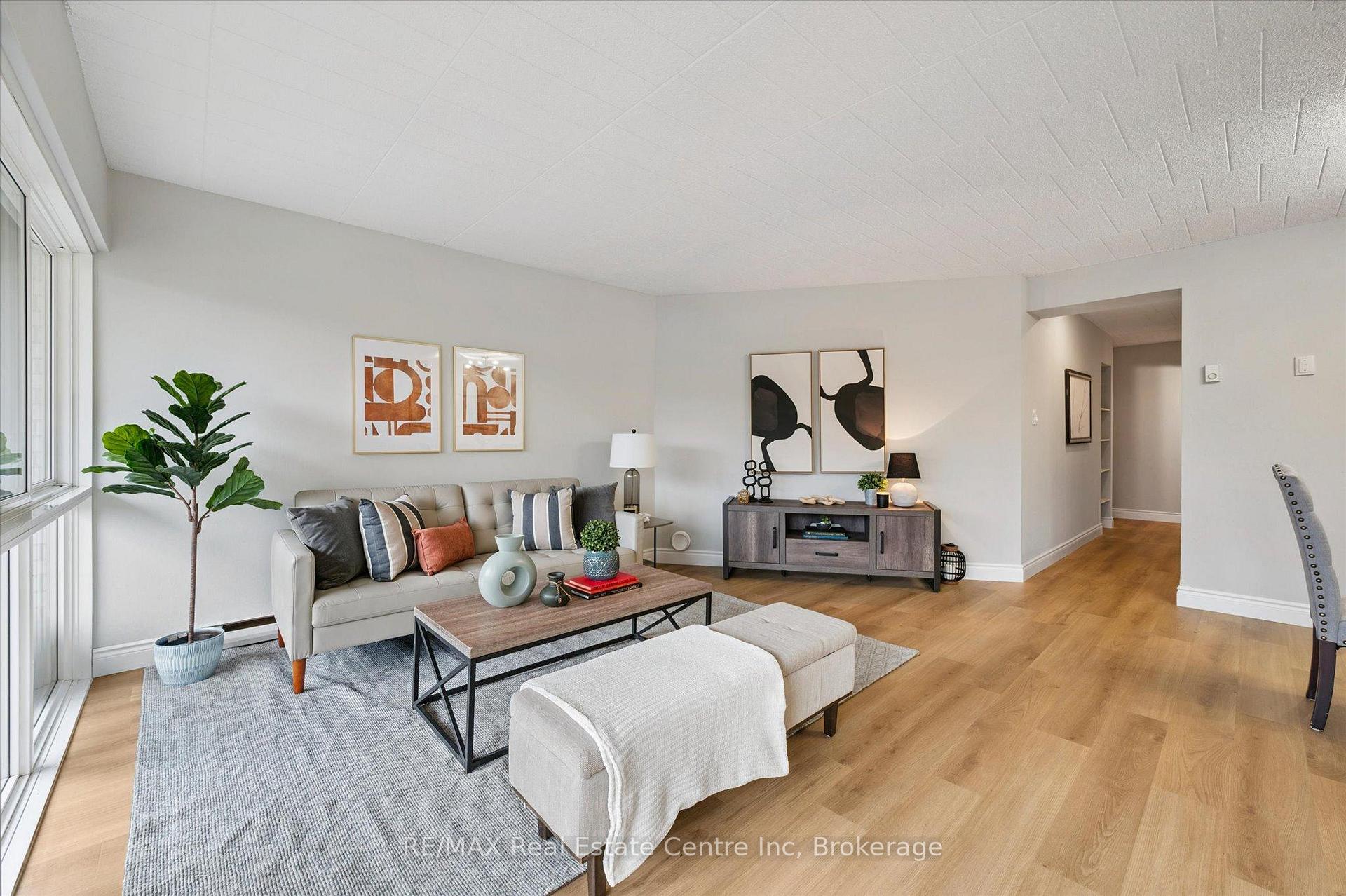 Welcome to 102-105 Conroy Crescent, a bright, NEWLY RENOVATED, 2-bedroom condo backing onto peaceful green space and scenic trails that lead to the river! With a completely refreshed interior and a location surrounded by everyday conveniences, this home offers unbeatable value for first-time buyers, investors and downsizers alike. Step inside and you'll immediately notice the brand-new flooring and the tastefully renovated kitchen, featuring crisp white shaker cabinetry, butcher-block countertops, subway tile backsplash, modern black hardware and a sleek black sink. The thoughtful addition of open shelving and in-suite laundry makes this kitchen as functional as it is stylish. The spacious living and dining area is flooded with natural light from a full wall of windows. Freshly updated with neutral wide-plank flooring, this open-concept space is perfect for both relaxing and entertaining. Sliding doors lead to your large private balcony overlooking greenery-an ideal spot for your morning coffee or unwinding at the end of the day. The generously sized primary bedroom offers plenty of room for a king-size bed, while the second bedroom is perfect for guests, a home office or a roommate. A modern 4-piece bathroom completes the unit with updated vanity, fixtures and finishes. This condo includes an oversized parking spot located right next to the back building entrance, plus a convenient storage locker. The unit is situated on the main floor in a building with no elevator, making grocery trips and daily access a breeze. Just steps away is a bus stop with a direct route to the University of Guelph. You're also minutes from Stone Road Mall, LCBO, Shoppers, restaurants, banks, Dovercliffe Park and quick access to the Hanlon Parkway-perfect for commuters. Freshly renovated, move-in ready and set in a peaceful yet central location-this is an opportunity you won't want to miss!