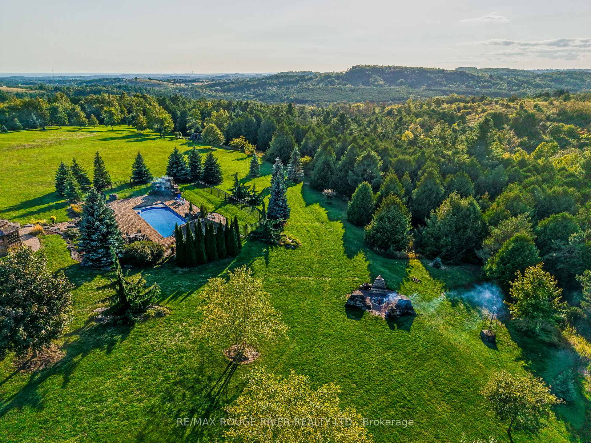 An Exceptional Country Estate in Northumberland County. Set on 24 acres of rolling countryside with uninterrupted 360-degree views, this distinguished estate offers a rare balance of architectural refinement and natural beauty, just minutes north of Cobourg and within comfortable reach of Toronto. Thoughtfully designed and built to exacting standards, the 11,000 sq. ft. residence (7,500 sq. ft. above grade) blends timeless proportions with modern comfort. The arrival unfolds across manicured grounds featuring orchards, curated stonework, and landscape installations by renowned artisan John Shaw-Rimmington, creating a setting that feels both composed and serene. Expansive stone terraces surround a resort-style pool, ideal for entertaining or quiet retreat. A private trail network winds through the property, leading to a hilltop vantage point with sweeping views toward Lake Ontario. Inside, the home is defined by volume and balance. A dramatic great room with 16-foot ceilings, marble columns, and a statement fireplace anchors the principal living spaces, complemented by more intimate rooms for everyday living. A Downsview-designed chef's kitchen, butler's pantry, and adj0oining family room offer a seamless blend of form and function. Seven bedrooms and six baths include a private two-bedroom suite with its own garage-ideal for guests or extended family. The primary suite features a dressing room, spa-inspired ensuite with heated floors. Geothermal heating and cooling, a heated three-car attached garage, a separate two-car garage/workshop, and curated designer finishes complete this quietly exceptional estate-well suited as a refined full-time residence or an elegant country retreat for local, GTA and international buyers seeking privacy, space, and distinction.