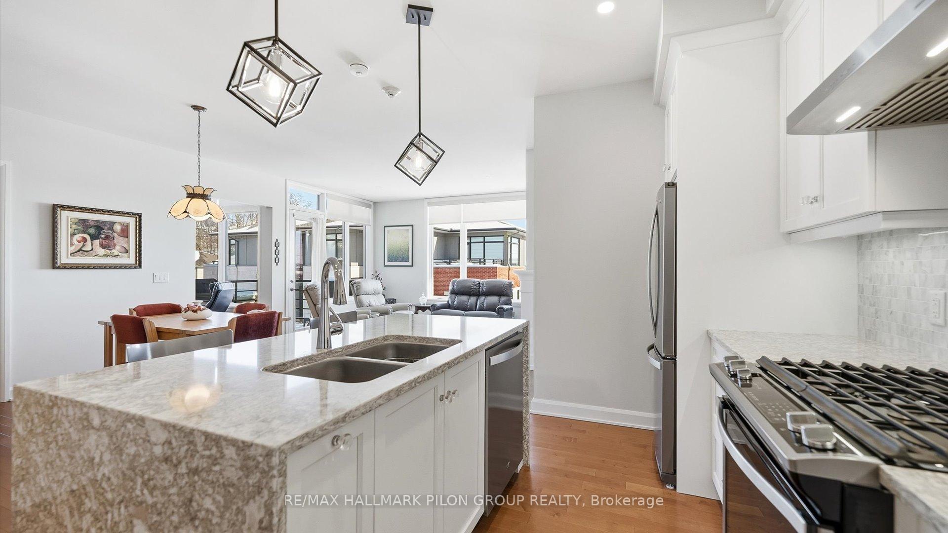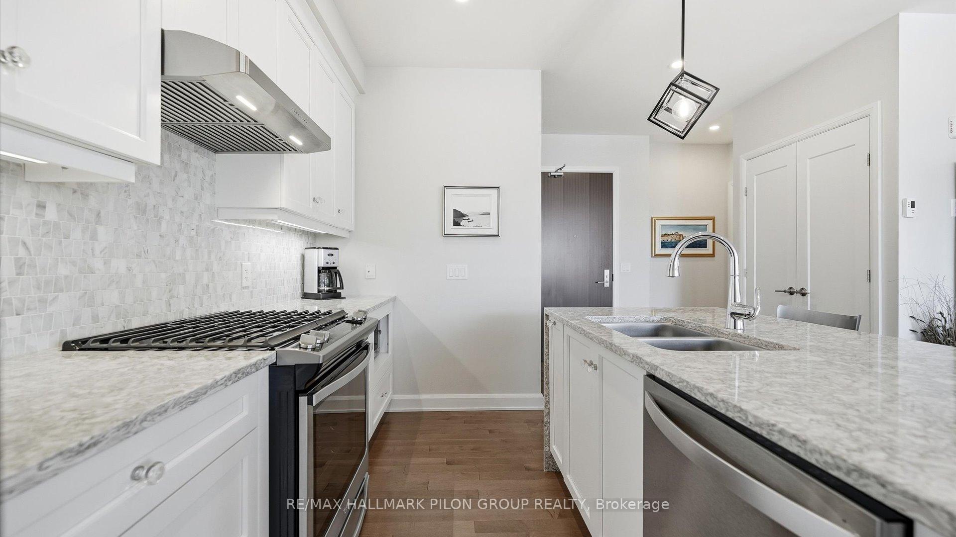 Welcome to The Elements at Richardson Ridge, an elegant residence located in the highly sought-after Kanata Lakes community. This luxurious top-floor unit offers approximately 1248 sqft of refined living space featuring 2 spacious bedrooms, 2 full bathrooms, & a separate den, all enhanced by 9ft ceilings, rich hardwood flooring throughout, & oversized windows that flood the home with natural light. The open-concept kitchen is both stylish & functional, showcasing a large eat-in island with waterfall quartz countertops, white cabinetry, marble tile backsplash, & stainless steel appliances including a gas stove. The kitchen flows seamlessly into the bright living area, highlighted by a natural gas fireplace, creating an inviting space for both everyday living & entertaining. The primary suite is a true retreat, complete with a spa-inspired 4-piece ensuite featuring double quartz vanities, a walk-in glass-walled shower, & a walk-through closet customized for optimal organization. A second bedroom with a picture window, a dedicated den/office, & a convenient in-unit laundry room with stacked washer & dryer complete the interior layout. Step outside to the top-floor private balcony, ideal for summer dining, complete with natural gas BBQ connection & breathtaking views of the Heritage Richardson House & the residents' private clubhouse. Additional features include one underground heated parking space, one outdoor parking space, & a dedicated storage locker. The building is fully accessible, offering a large elevator and sloped ramps at the main entrance. EV charging is available, subject to board approval. Ideally located within walking distance to the Signature Centre & Kanata Centrum & Tanger Outlets Ottawa, & just steps from the 4 km Carp River Conservation Area, perfect for walking & biking. Close proximity to Kanata's North High-Tech District & the Canadian Tire Center adds to the appeal. Non-smoking condominium, including all units and common areas.