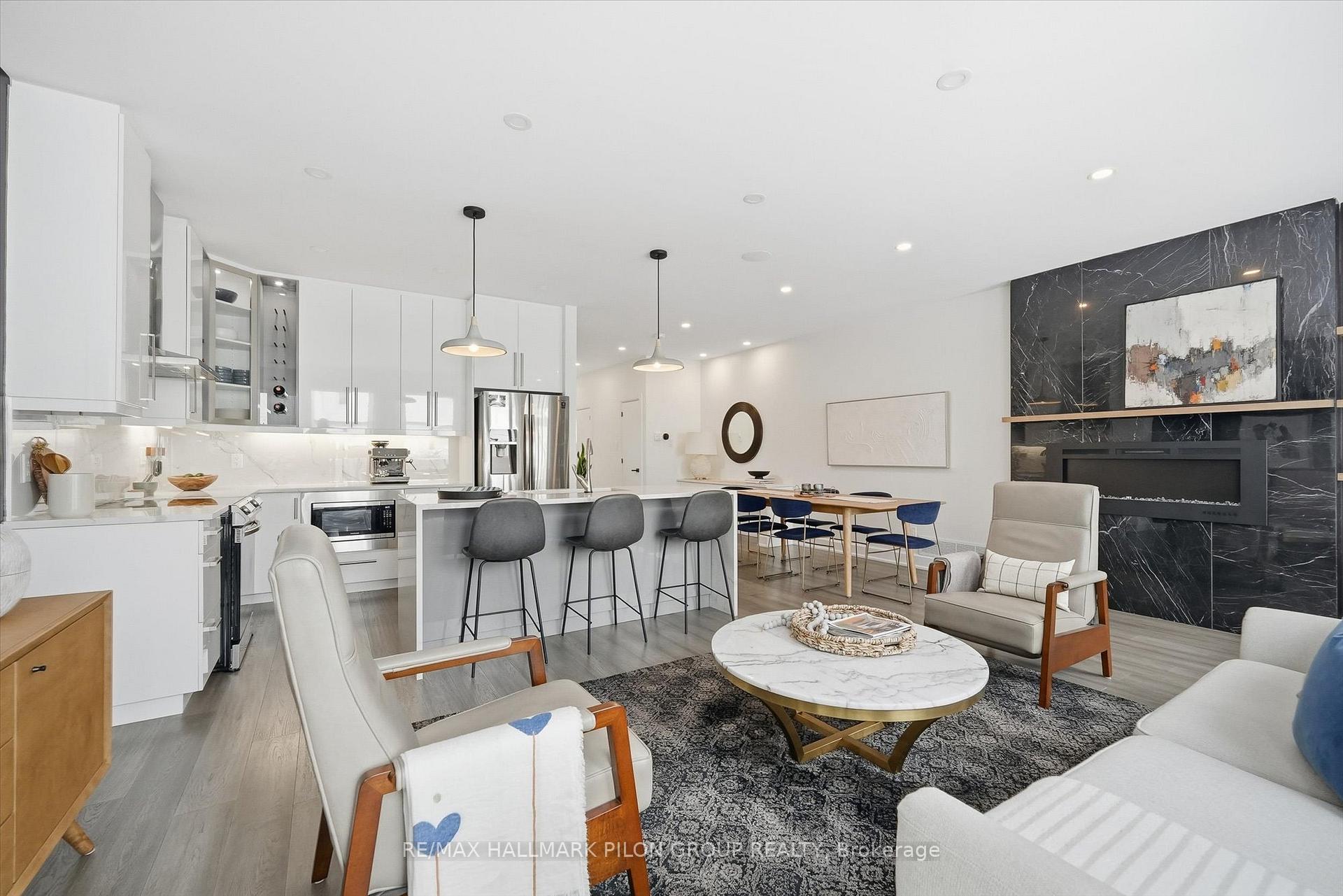 This exceptional contemporary end-unit luxury townhome offers 2,584 sq. ft. of beautifully designed living space, perfectly suited for today's modern lifestyle. Ideally located just minutes from downtown Ottawa, Montfort Hospital, major shopping centres, La Cité collégiale, and a full range of everyday amenities, this home combines convenience with refined living. The main level showcases an elegant open-concept layout, ideal for both daily living and entertaining. The designer kitchen features quartz countertops, sleek modern cabinetry, stainless steel appliances, and a striking double-sided waterfall island that anchors the space. Architectural highlights include a glass staircase, high ceilings with pot lights, and a sophisticated electric fireplace, creating a bright and contemporary atmosphere throughout. The second level offers three generously sized bedrooms, each with walk-in closets and engineered flooring. A well-appointed main bathroom, a separate laundry area, and a luxurious primary ensuite complete this floor. The ensuite features double sinks, a relaxing Roman tub, and a glass shower accented with mosaic tile, offering a spa-like retreat. A separate side entrance on the main level provides excellent flexibility for those considering an in-law suite or secondary dwelling. The fully finished lower level includes an additional kitchen, bedroom, and bathroom, making it ideal for extended family, guests, or future income potential. Additional exterior features include a fully fenced yard and an extended driveway that accommodates up to four vehicles, adding practicality and convenience for multi-car households or visiting guests. Thoughtfully designed and move-in ready, this home offers luxury, versatility, and an unbeatable location, an outstanding opportunity for discerning buyers seeking both style and substance.
