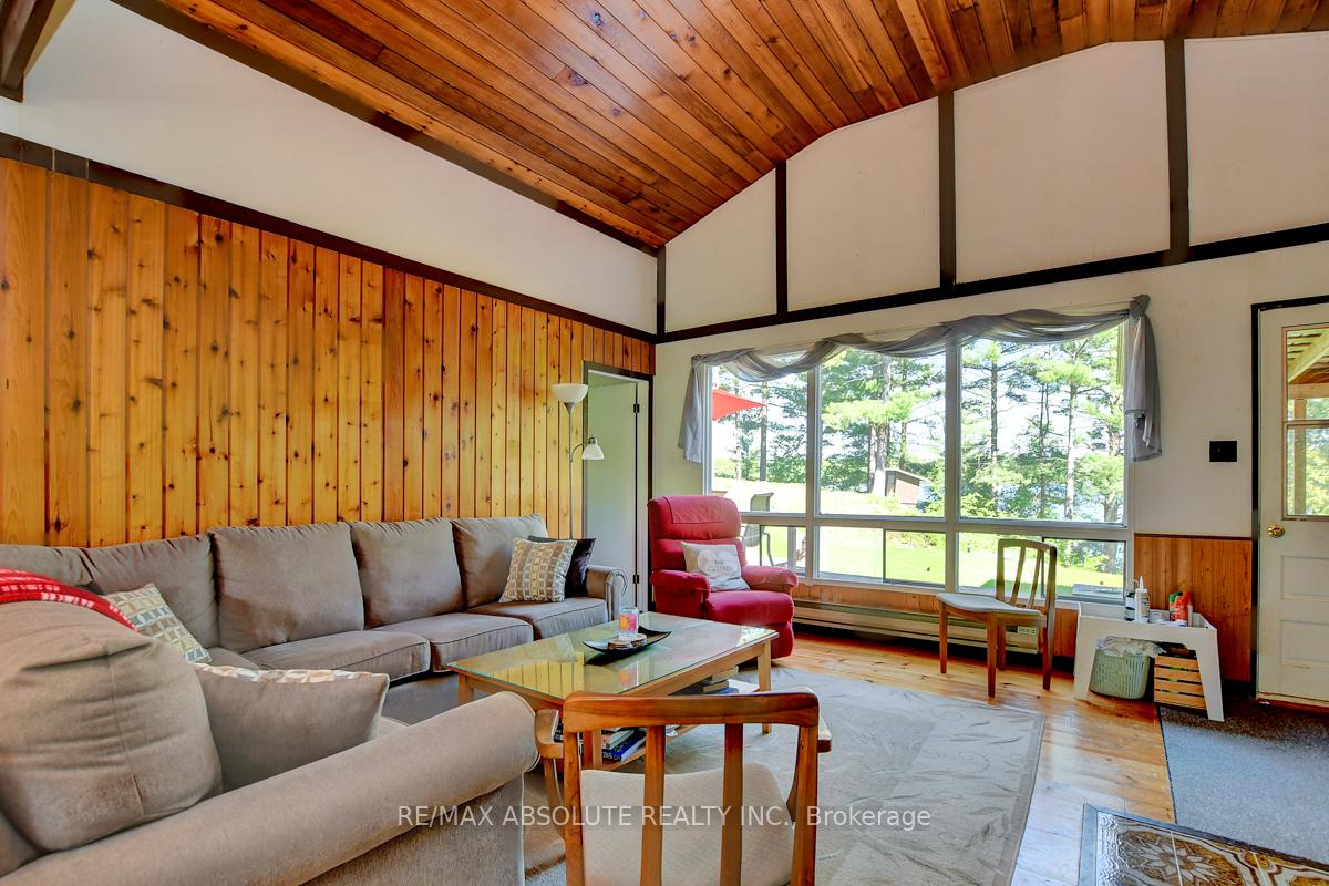 Rare opportunity to own 6.9 acres of waterfront with approximately 850 feet of shoreline and mature mixed forest offering exceptional privacy. This rustic three-season cottage features tongue and groove pine ceilings, a durable metal roof, and an open-concept living area with expansive lake-facing windows. Three bedrooms provide cozy accommodations, while a screened sunroom and spacious deck are ideal for outdoor entertaining. Set slightly elevated, a newer staircase leads down to the water and a large dock in a private bay, perfect for swimming and boating. Property offers excellent future potential to enjoy as-is, build, or explore severance possibilities (buyer to complete due diligence with township). Water source is lake intake. Annual road maintenance fee $134. 24-hour irrevocable on all offers.