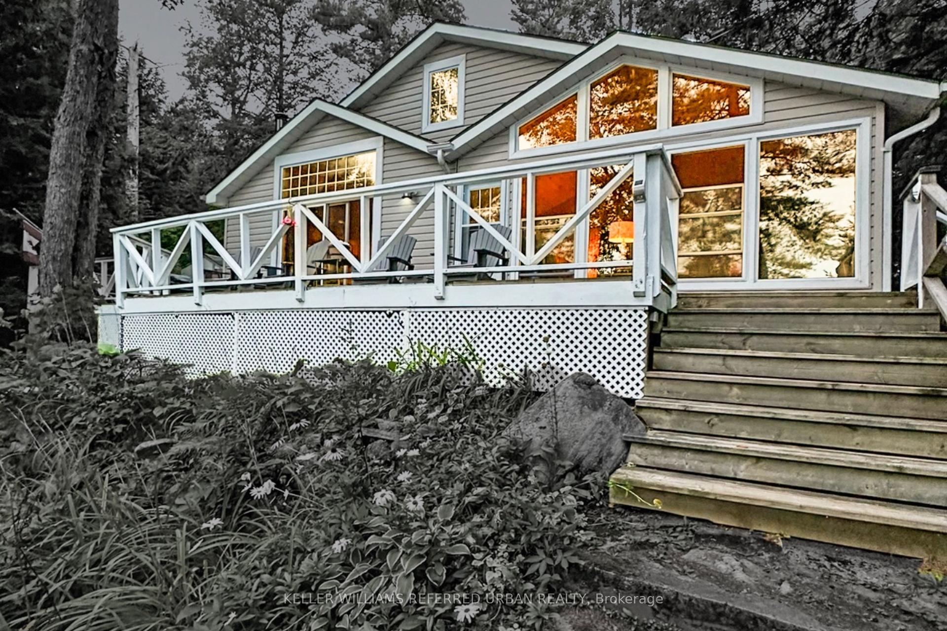 A truly special waterfront cottage in one of Muskoka's most sought-after settings, only 2 hours from the GTA, on Pine Lake. This cottage offers impressive privacy & lake views, and properties like this are seldom available on Pine Lake. Many neighbours comment on the exceptional lake view this property enjoys. Set on a private bay with southern exposure, enjoy sun throughout the day, calm water for safe swimming away from heavier boat traffic, & notable privacy. Morning coffees on the dock & evenings on the expansive wrap-around deck overlooking the lake are perfect for evening cocktails. Located on just over 2 acres, the property features mature trees & wooded trails connecting to established walking paths spanning the entire lake. Owned road shore allowance enhances shoreline access & value. Vaulted pine ceilings & expansive windows create bright, inviting interiors. The updated kitchen & appliances flow into the open-concept living & dining areas, which feature a wood-burning stove. The newly rebuilt Muskoka room (approx. 300 sq ft) increases total interior living space to over 1,200 sq ft & captures expansive lake views. Three bedrooms, plus a bunkie with queen bunk beds & workspace, allow flexibility. High-speed internet, satellite TV, newer potable well, full laundry, two sheds, & year-round private road access add convenience. Just 20 minutes to Bracebridge's full range of amenities. A rare waterfront opportunity in Muskoka.