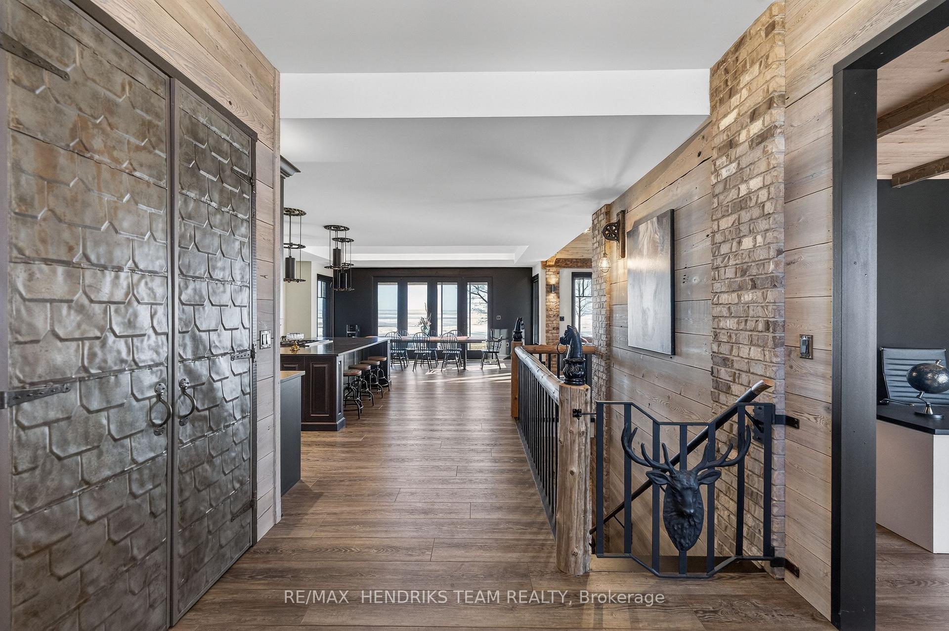 Behind a gated entrance and down a winding tree-lined driveway sits a lakefront estate along the shores of Lake Erie in the community of Dunnville. Welcome to 515 Sandy Bay. Set on over 5.5 acres with more than 270 feet of shoreline, this sprawling bungalow blends contemporary design with natural materials including stacked stone, wood accents, exposed beams and steel structural elements. The layout captures lake views from the main living areas. From the foyer, sightlines extend through the kitchen and dining area toward the water. The kitchen features black cabinetry, suede granite countertops, a large island with seating, pebble stone backsplash, Wolf gas range, double built-in ovens, custom panel refrigerator and a walk-in pantry accessed through a repurposed horse stable door. The main level is divided into two wings. One side includes the bedrooms and bathrooms, while the other opens to the living room, glass sunroom & home office. Vaulted ceilings, exposed beams and stone fireplaces frame the lake views while large windows provide natural light. The primary suite features a walk-in closet and an ensuite with tin ceilings, floating wood vanity with chain detail, walk-in glass shower and black soaker tub positioned toward the lake. The fully finished lower level is accessed by a steel beam staircase with wood capping. Stone feature walls and an electric fireplace are featured throughout. Bedrooms include barn doors, wood and log feature walls, a custom lake mural and a converted wine cellar now used as a children's bedroom. Exterior features include a gated entrance, winding driveway with lighting, fruit trees, raised garden beds and a fenced yard. Massive stone walkways, a fire pit area and rock steps lead to the shoreline. A covered patio off the kitchen provides space for outdoor dining and entertaining. A detached shop offers space for storage, boats or hobbies and includes a finished one-bedroom apartment ideal for guests or extended family.