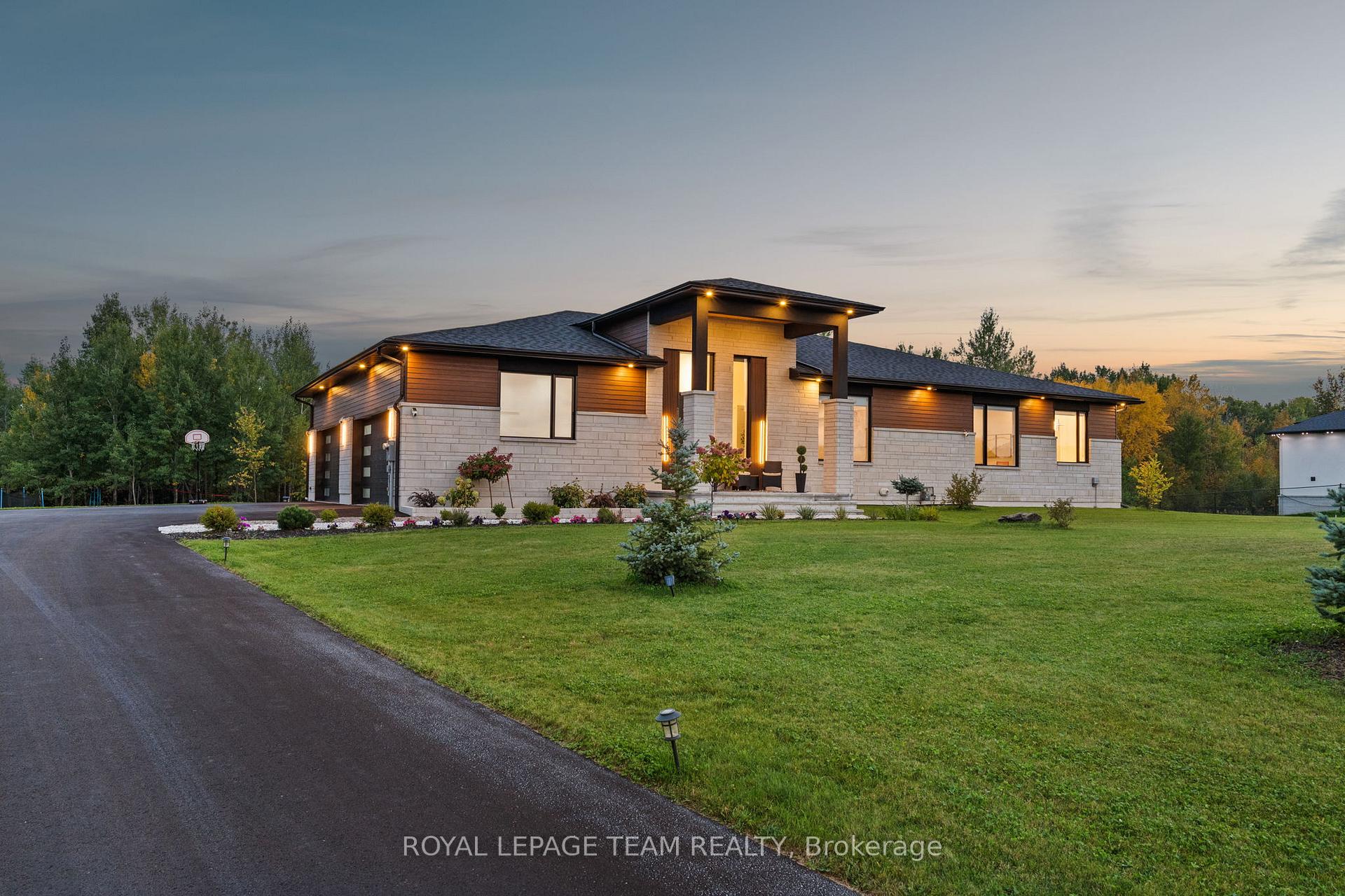 This custom-built luxury bungalow offers over 5600 sq ft of total finished living space, set on a rare estate-sized lot of over 2 acres in an upscale, low-density community. Built in 2023, the home combines modern design with exceptional space and privacy, while remaining conveniently located near major amenities and Ottawa's high-tech employment hub. The thoughtfully designed layout includes 5 bedrooms and 4 bathrooms, with 3 bedrooms on the main level and 2 bedrooms in the lower level, ideal for multi-generational living, flexible family needs, or home office use. Ceiling heights reach up to 15 ft in the foyer and living room, with 10 ft ceilings across the main level, complemented by large black-framed double-pane windows that flood the home with natural light and enhance its architectural presence. The open-concept living area flows seamlessly into a modern kitchen featuring a waterfall quartz island, full-height quartz backsplash, custom soft-close cabinetry, and a premium appliance package. The primary suite offers a private retreat with a spa-inspired ensuite, including a freestanding soaking tub, glass-enclosed rain shower with body jets, and a custom walk-in closet. The lower level extends the living space with a spacious recreation area, electric fireplace (included), dedicated home gym, additional bedrooms, and a full bathroom finished to the same high standard as the main floor. Outdoors, the property features professionally landscaped grounds, interlock patios and walkways, a covered terrace, custom pergola, mature trees, multi-zone irrigation, and architectural exterior lighting. Additional highlights include a 4-car attached garage with epoxy flooring, extensive parking, smart home technology, comprehensive LED lighting, full security system, and electric fireplaces on both levels. This move-in-ready bungalow presents a rare opportunity to enjoy space, privacy, and modern luxury in one of the area's most desirable communities.