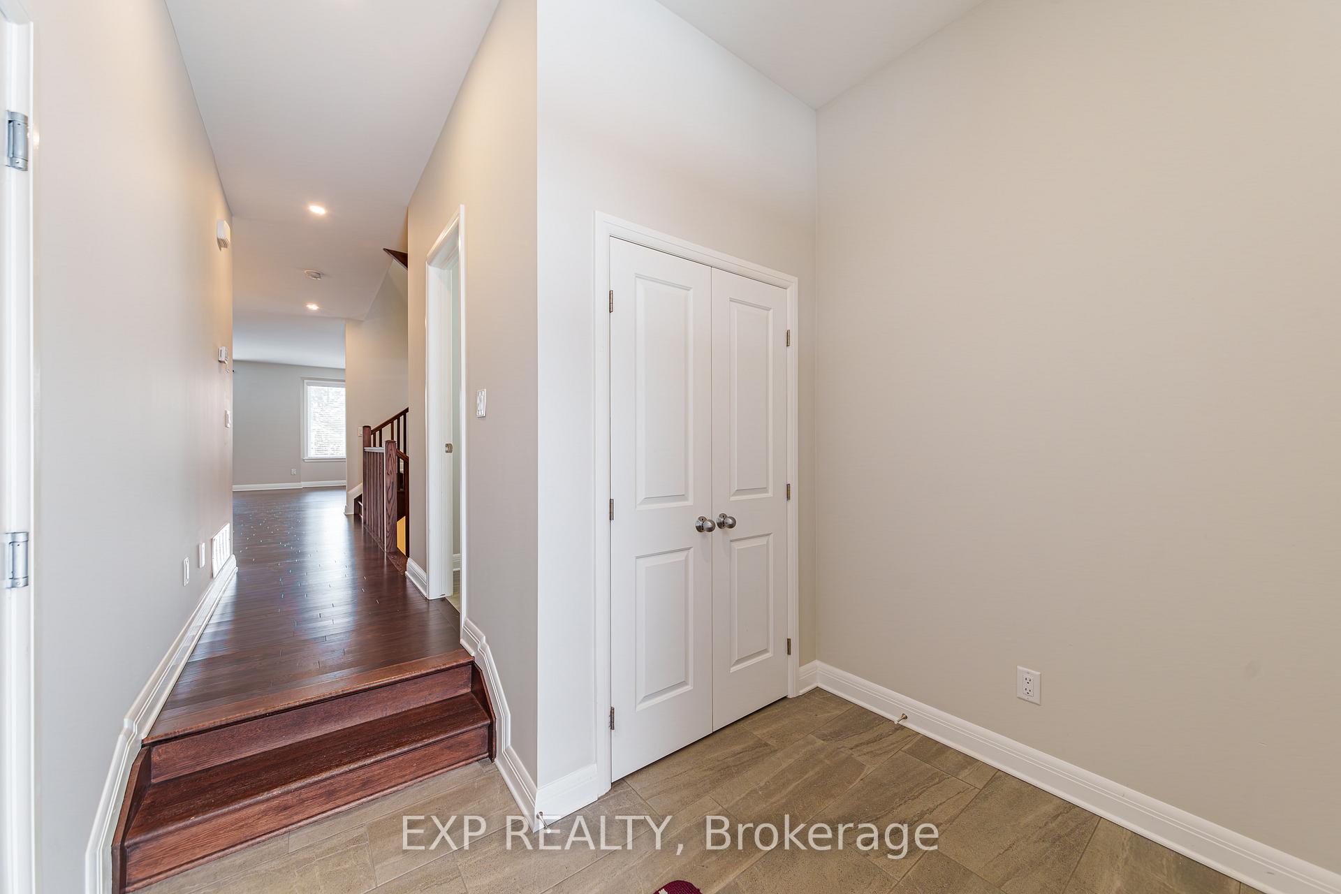 Welcome to this stunning, large end-unit townhome in the highly sought-after community of Stonebridge, offering no front or rear neighbours and a groomed tree view from the back on all three floors. Built by Uniform, this Lawrence model offers approximately 2,265 sq.ft. of beautifully finished living space with thoughtful upgrades throughout.The bright, open-concept main floor features hardwood flooring and a spacious living area anchored by a cozy gas fireplace controlled by a light switch. The gourmet kitchen includes quartz countertops, an extended island, soft-close cabinetry, and four stainless steel appliances, including a fridge with filtered water and automatic ice maker. Patio doors lead to a deck, perfect for entertaining.Upstairs, closets have been upgraded with double hanging, and the primary suite boasts a walk-in closet system and a luxurious ensuite. Large medicine cabinets enhance both bathrooms, and a convenient second-floor laundry adds function.The fully finished walk-out basement includes hardwood floors, a full 4-piece tiled bathroom, and patio doors leading to a private backyard. Outdoors, enjoy stone pathways, a 3-year-old 8'x10' shed, and perennial gardens with peonies, lilacs, magnolia, phlox, irises, hydrangeas, and roses.Additional features include blinds throughout, privacy film on select windows, a full retractable front door screen, Celebright roofline lighting controlled by a phone app, a security system, and all rooms freshly painted. Located minutes from shops, parks, and amenities, this home offers comfort, privacy, and exceptional living.