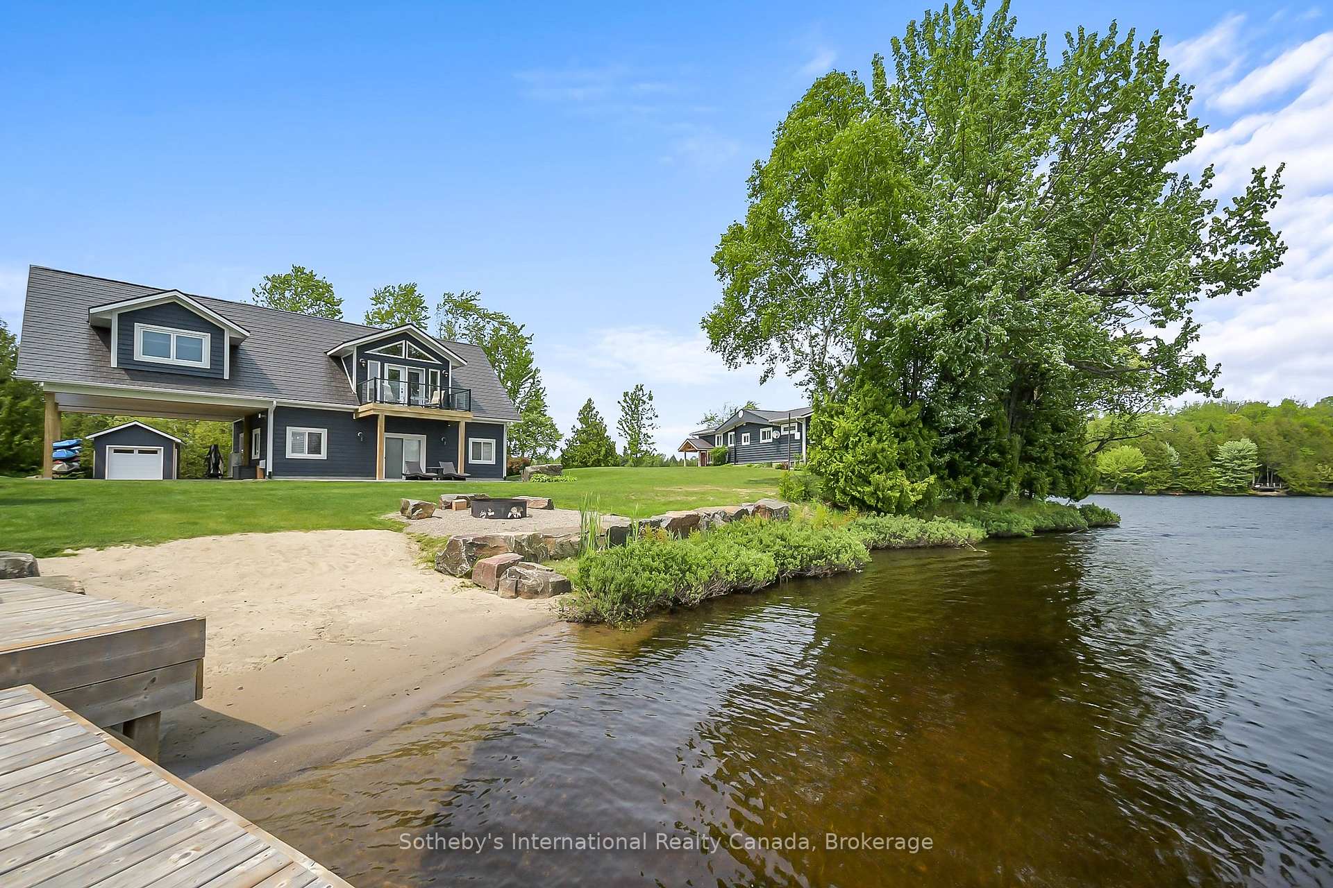 Rare Whitestone Lake point lot with 490 ft of shoreline, full south and West exposure & long lake views. This unique property features two fully serviced dwellings, ideal for extended family, guests, or income potential. The main home offers 2 bedrooms and 2 bathrooms with an open-concept layout and expansive lake views. The detached 1,456 sq ft carriage house includes 2 additional bedrooms, 1 bathroom, a 2-car heated garage, and a covered port. The flag stone patio and lakeside firepit, Deep water, beach, and exceptional privacy enhance the appeal. An ideal setting for a private family retreat, multi-generational living, or a legacy waterfront investment. Opportunities with this level of scale, seclusion, and versatility are rare on Whitestone Lake. Extra lot, including all services (electricity, well, septic), available upon request.